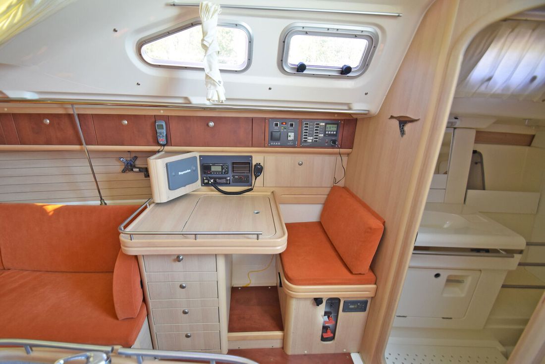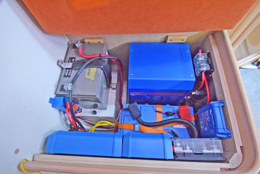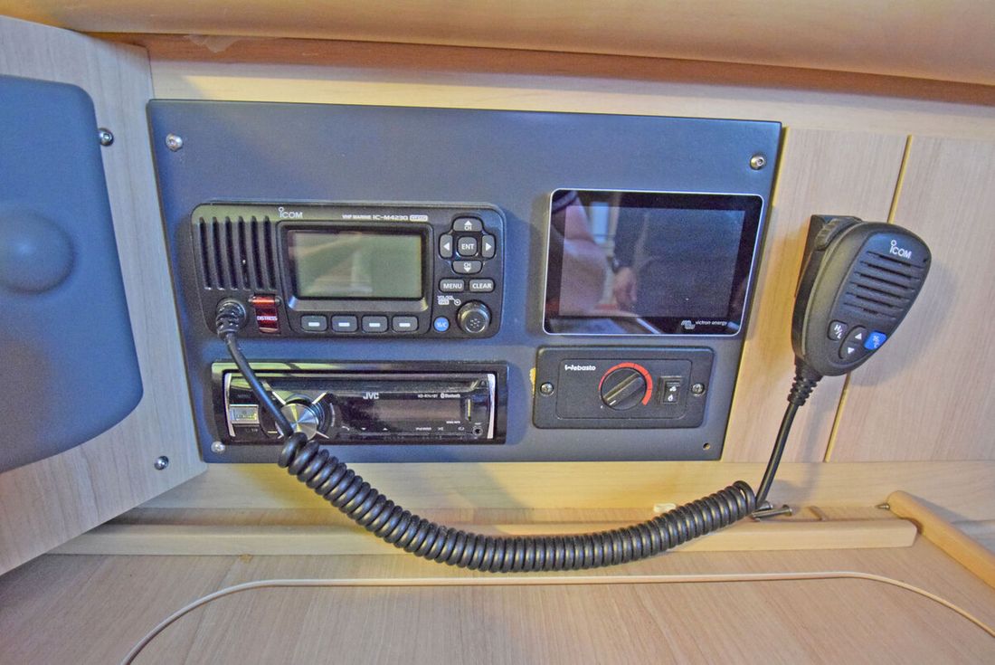 1x startaccu AGM 66 Ah, 1x LiFePO4 Victron lithium service accu 330 Ah Smart, Victron Multiplus 12/3000/120 lader/omvormer, Victron Orion XS 12/12-50A DC DC lader, Victron Lynx Smart BMS 500, Victron Lynx distributor, Victron Smart Battery Protect, Victron Cerbo GX, Victron GX Touch 50, 12 Volt systeem, walstroomaansluiting met aardlekschakelaar, Victron multiplus omvormer/acculader 12/3000/120, Plastimo stuurstand kompas, Raymarine ST60 Depth, Raymarine ST60 Speed, Raymarine ST60 Wind, Raymarine E7 Hybrid kaartplotter buiten, TrueHeading Class-B AIS, Raymarine C70 kaartplotter binnen, Icom IC-M423 met 2e handset Commandmic HM-195 voor buiten, JVC radio/CD speler, Raymarine ST6001 Smartpilot stuurautomaat onderdeks aangesloten op Jefa drive, afstandbediening voor de stuurautomaat, Trilens radarreflector, navigatieverlichting.