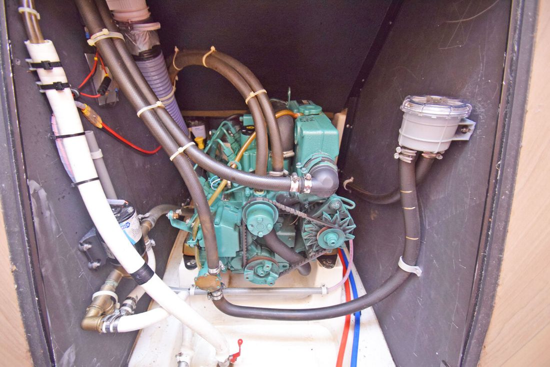 Volvo Penta MD2030-D, 28 pk, bouwnummer 5102178600, bouwjaar 2005, diesel, verbruik ca. 2 liter/uur, saildrive, manchet vervangen winter 2013/2014, indirecte koeling, 3-blads Volvo Penta klapschroef, RVS brandstoftank 110 liter, toerenteller, display urenteller geeft geen uitlezing geschat ca. 2.100 uur, signaal voor oliedruk en temperatuur, brandstofniveaumeter.